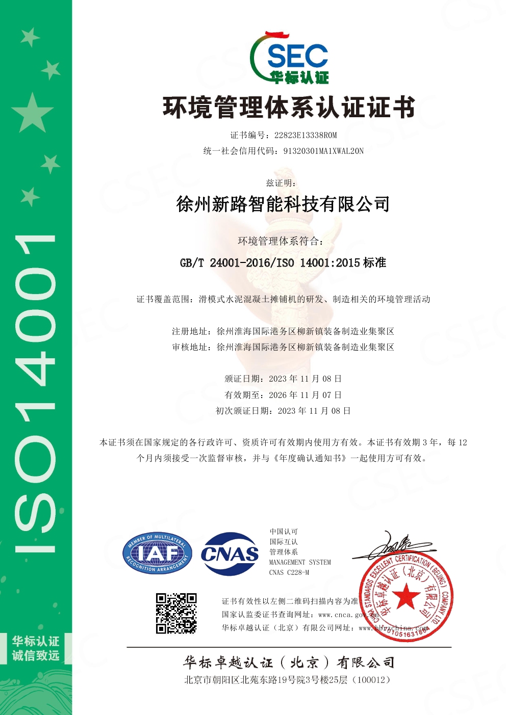 環(huán)境管理體系認(rèn)證證書